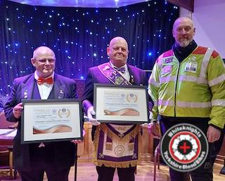 Andy Hunn from The Widows Sons Masonic Lodge, Pocklington receives a Whiteknights’ Champions certficate for being instrumental in the donation of a new BMW R1250rt with additional maintenance funding.